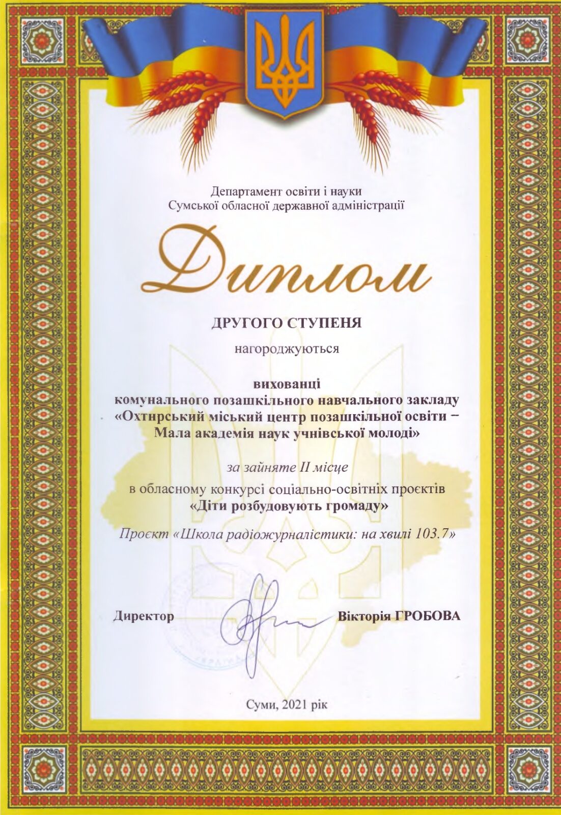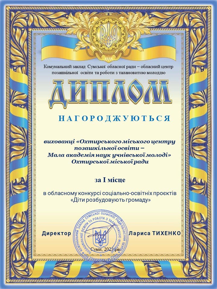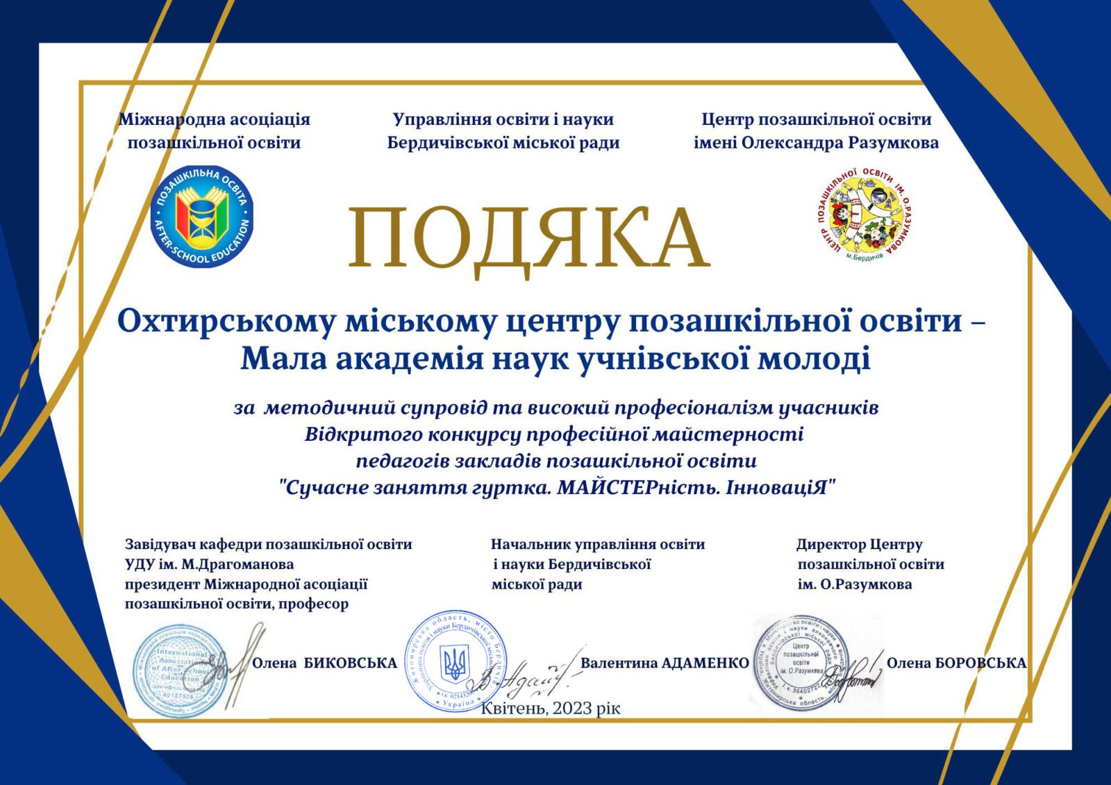 Чотири роки поспіль у 2019-2022 рр., завдяки участі й перемогам юних науковців у Всеукраїнській олімпіаді з креативності «Destination Imagination» Комунальний позашкільний навчальний заклад «Охтирський міський центр позашкільної освіти-Мала академія наук учнівської молоді» було визнано місцем інновації та креативності.